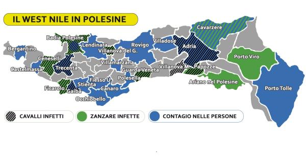 A Cavarzere, rilevati anche cinque focolai di zanzare infette. Altri tre sono stati registrati a Villanova del Ghebbo, così come a Badia; mentre sono diventati ben dieci i focolai di zanzara con West Nile rilevati a Ceneselli.