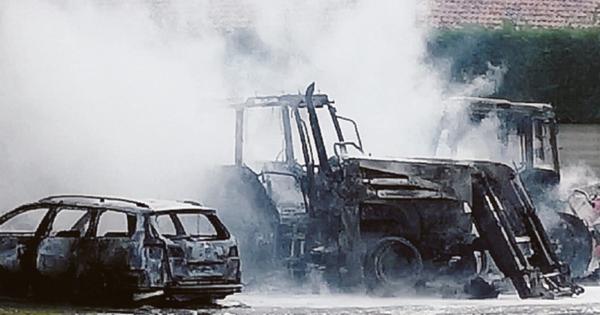 Un escavatore, un trattore e un’automobile completamente distrutte. Vigili del fuoco all’opera