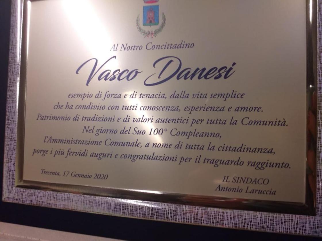 Ecco, di seguito, il testo: "Al nostro concittadino Vasco Danesi, esempio di forza e di tenacia, dalla vita semplice, che ha condiviso con tutti conoscenza, esperienza, amore. Patrimonio di tradizioni e di valori autentici per tutta la comunità. Nel giorno del suo centesimo compleanno, l'amministrazione comunale, a nome di tutta la cittadinanza, porge i più fervidi auguri e congratulazioni per il traguardo raggiunto".