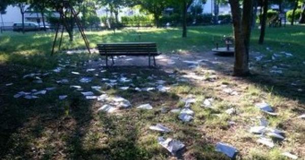 Il parchetto di via Togliatti riempito di pagine di libri stracciati