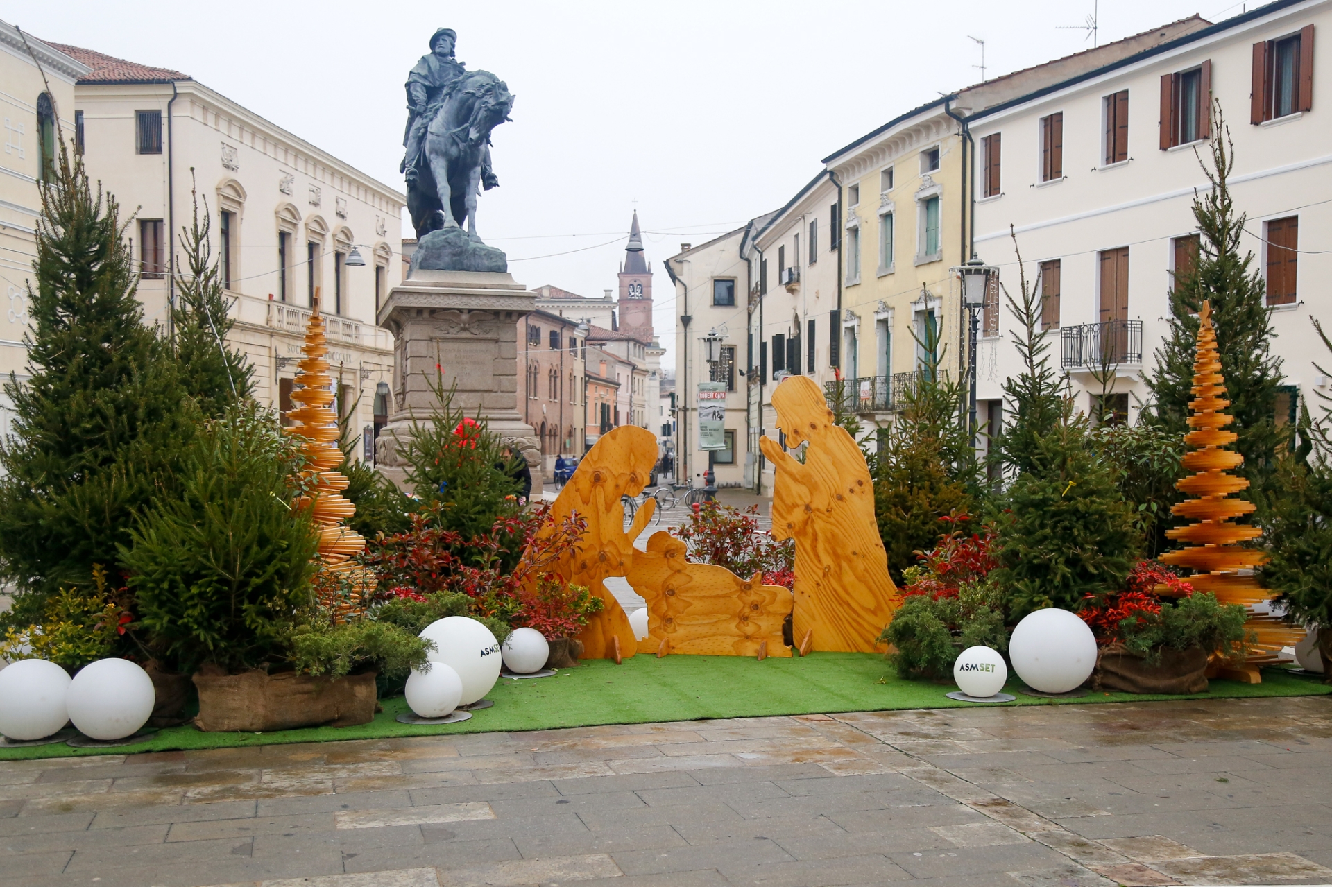 Lo spirito del Natale invade il centro città, grazie al contributo di Asm Set con il bosco urbano. Una piccola area verde in piazza Garibaldi, creata grazie all'apporto della società Tecnoverde di Villadose, con al centro un presepe, in legno, a richiamare l'importanza della sostenibilità, parola chiave per il futuro secondo Asm set.