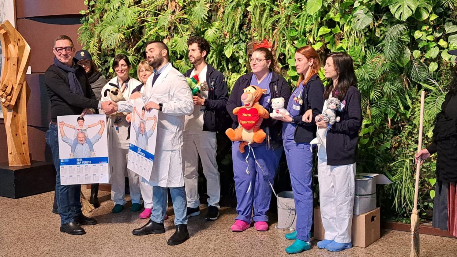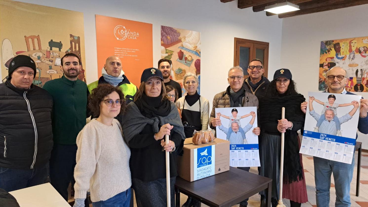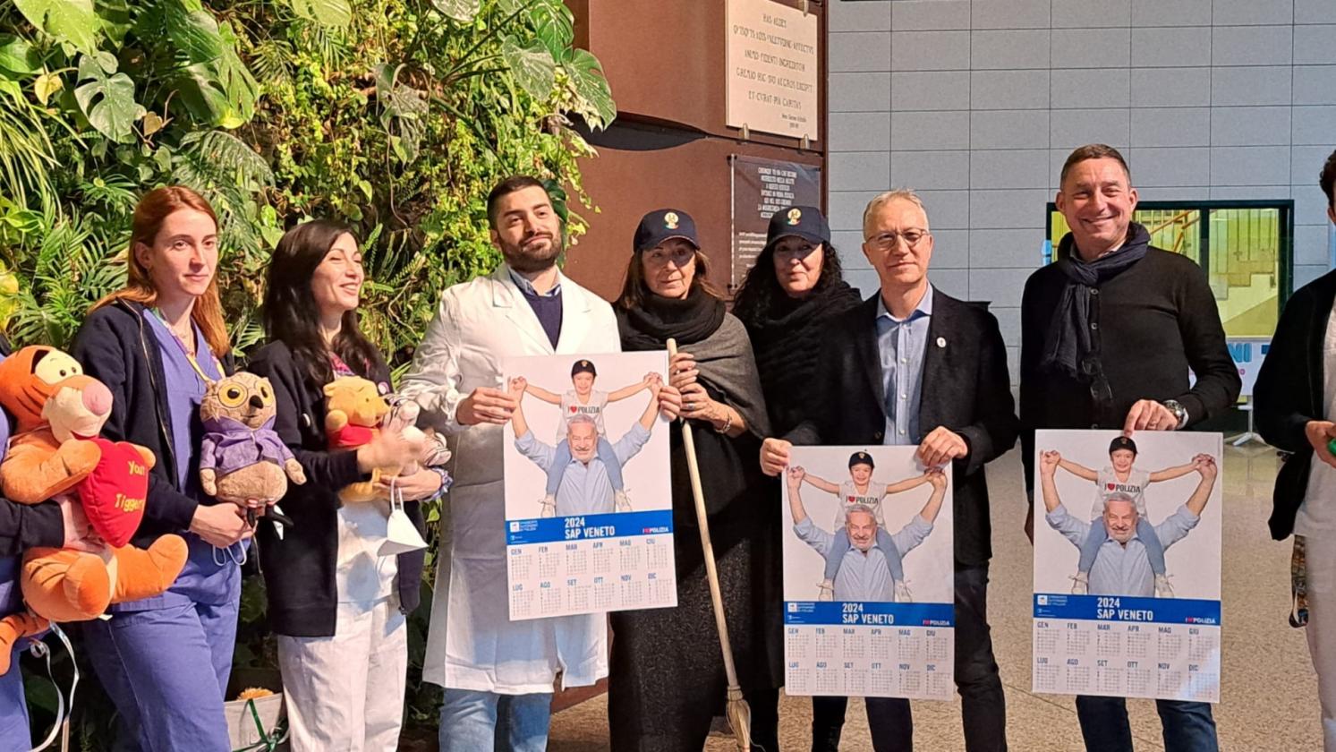 "Con l'occasione sono stati donati ai Medici ed agli Infermieri dei reparti il calendario Sap Veneto 2024, giunto alla 22° edizione della apprezzata serie realizzata da Heads Production grazie al creativo Federico Vanin ed al fotografo Nicola De Marchi, con una foto raffigurante una bimba "poliziotta" sulla spalle di una persona anziana, che ha lo scopo di lanciare un messaggio di sicurezza reciproca ad entrambi i soggetti raffigurati".