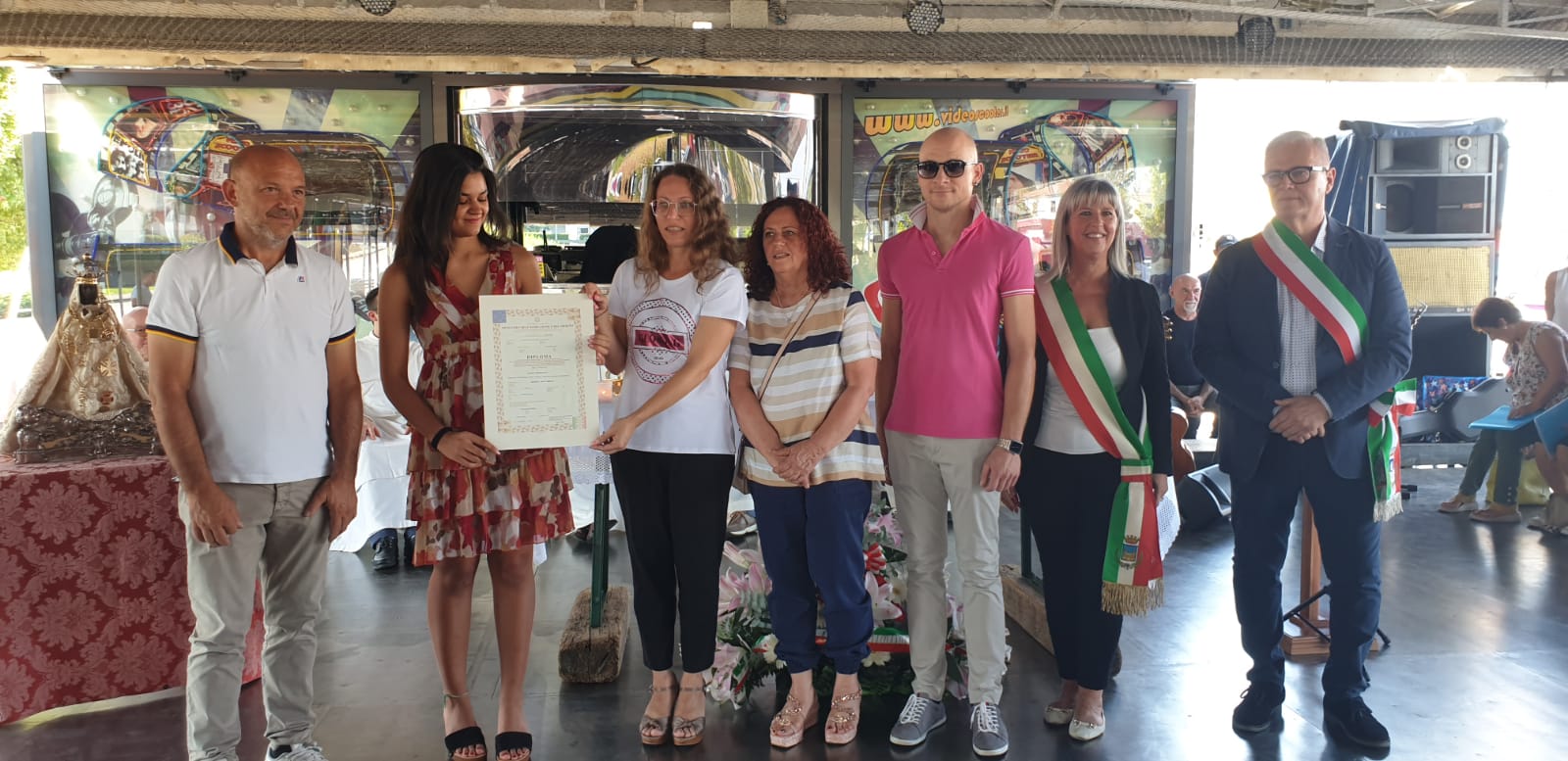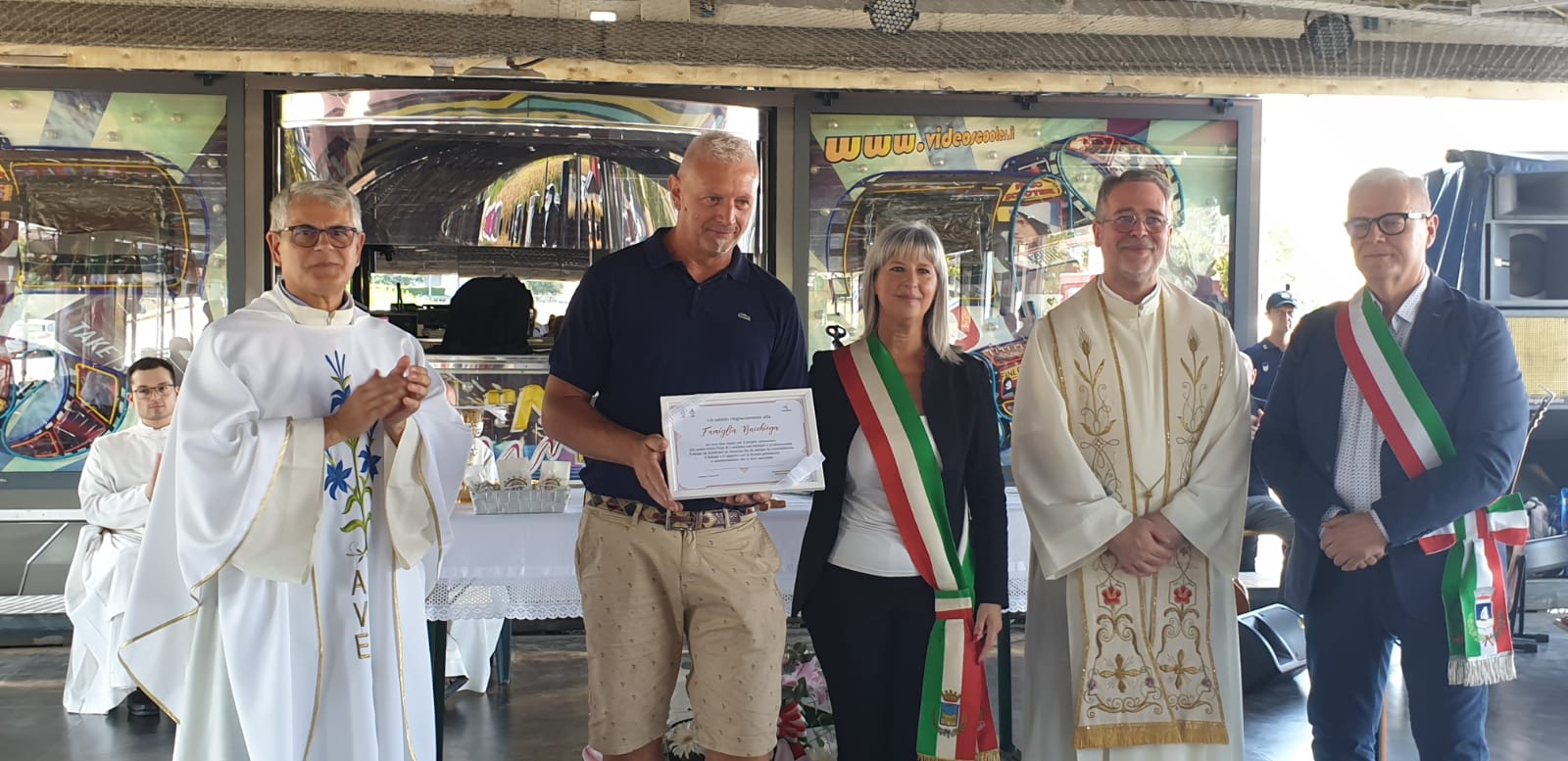 Dopo la benedizione solenne, proprio la famiglia Bacchiega è stata protagonista di due momenti simbolici, a partire dalla consegna di una pergamena di ringraziamento ad Alessandro Bacchiega da parte dei sindaci presenti. L'impegno dei giovani è poi stato riconosciuto con la consegna del diploma di maturità a Rosita, figlia di Alessandro, da parte di rappresentanti dell'Istituto Munari di Castelmassa.