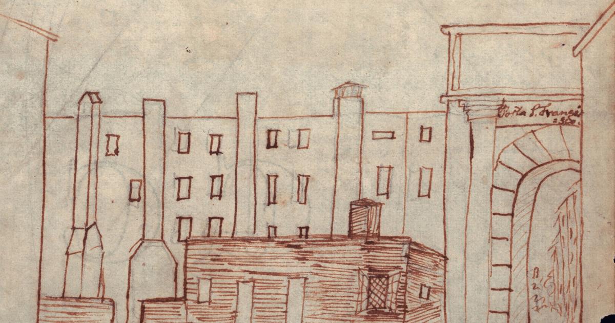 Schizzo di via Silvetsri con l'antica porta san Francesco (demolita) eseguito da Andersen, © Hans Christian Andersen's House. Museum Odense