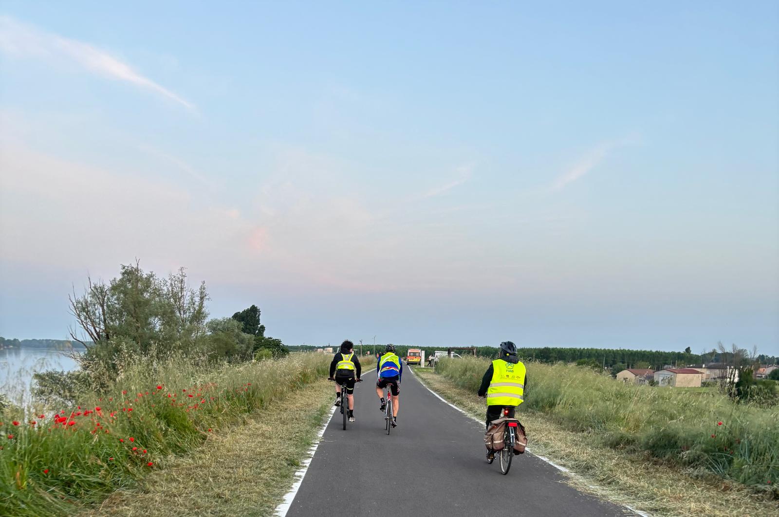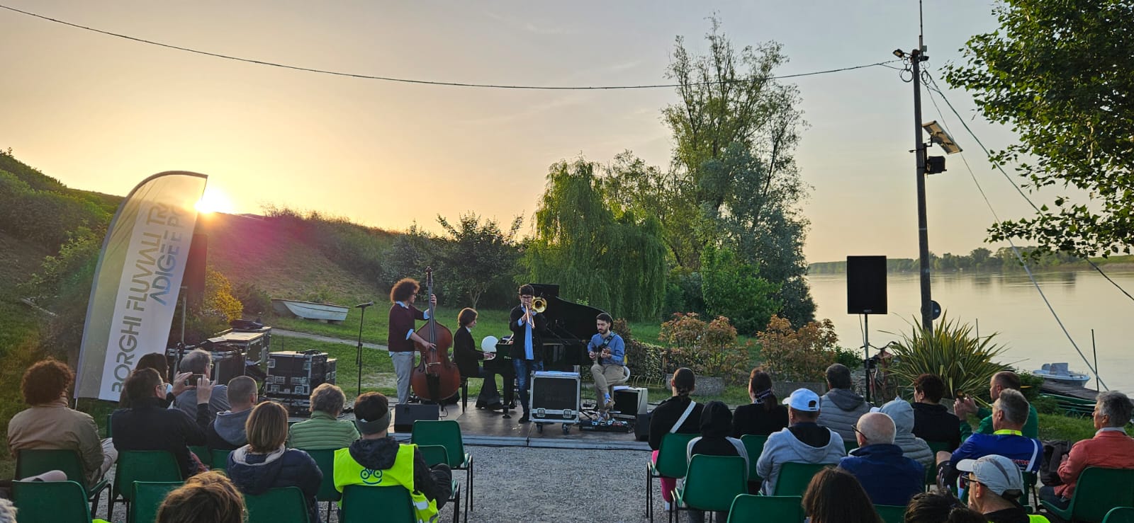 Decine e decine di appassionati hanno lasciato Occhiobello e Rovigo alle 5 del mattino, guidati da Fiab Occhiobello Sinistra Po. Il serpentone luminoso ha attraversato argini e golene fino all’imbarcadero di Gaiba, raggiunto poco prima delle 6. Qui i ciclisti hanno trovato caffè bollente e un orizzonte pronto a tingersi di rosa. Poco dopo le 6, mentre il sole emergeva oltre il fiume, il pianoforte di Filippo Rosini ha dato il via a un set evocativo dedicato al paesaggio fluviale. Il trombone di Paolo Mancini, la chitarra di Mauro Pani e il contrabbasso di Thomas Lotti, tutti musicisti del Conservatorio Venezze di Rovigo, hanno completato un tessuto sonoro capace di fondere improvvisazione e tradizione, regalando ai tanti presenti un momento sospeso tra natura e musica.