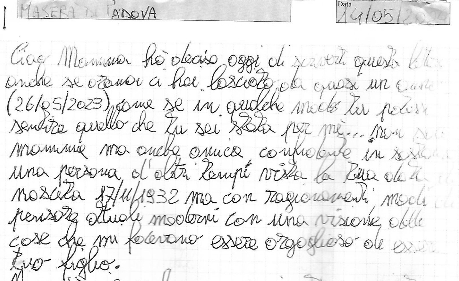 Il documento porta una data precisa: 14 maggio 2024, località Maserà di Padova. L’Adriatico l’ha custodito per oltre un anno, restituendolo sgualcito su un lato, segnato dalla salsedine e dall’umidità che il tappo di sughero non è riuscito a fermare. Eppure le parole restano leggibili, come se anche la carta avesse deciso di resistere. La lettera arriva a poco meno di un anno dalla morte della madre evocata nelle righe: il tempo del lutto, insomma, è ancora vivo e pulsante.