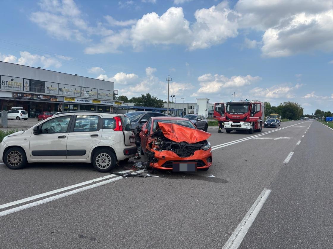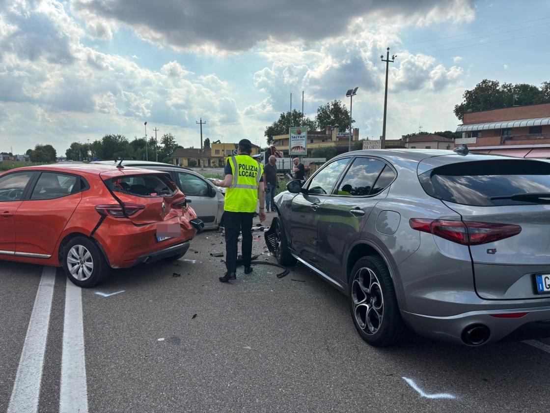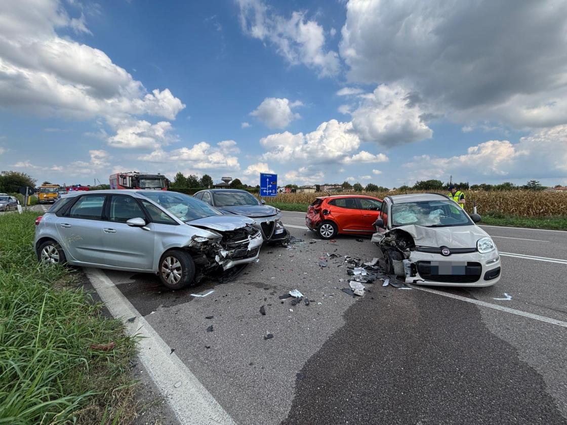 Le auto coinvolte sono una Reanult Clio rossa, rimasta pesantemente danneggiata sia nella parte frontale che in quella posteriore; un’Alfa Romeo Q4 grigia, con pesanti danni sulla parte anteriore destra; una Fiat Panda bianca, danneggiata sia davanti che dietro; e un Citroen C4 grigia, con danni nella parte anteriore sinistra.