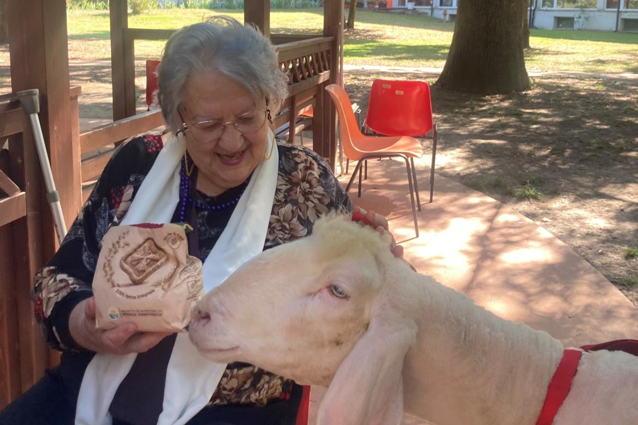 Giulia, la pecora che Gabriella ha salvato quattro anni fa da morte certa, è cresciuta come animale d'affezione ed è solita recarsi in strutture residenziali per portare momenti di benessere e gioia alle persone più fragili. "E' stata davvero una bella esperienza essere ospitati all'Iras - spiega Gabriella, di professione insegnante - l'accoglienza è stata calorosa per Giulia ed io mi commuovo sempre osservando i sorrisi che nascono spontaneamente quando Giulia interagisce con nonne e nonni. La connessione profonda e non giudicante che si crea è meravigliosa".
