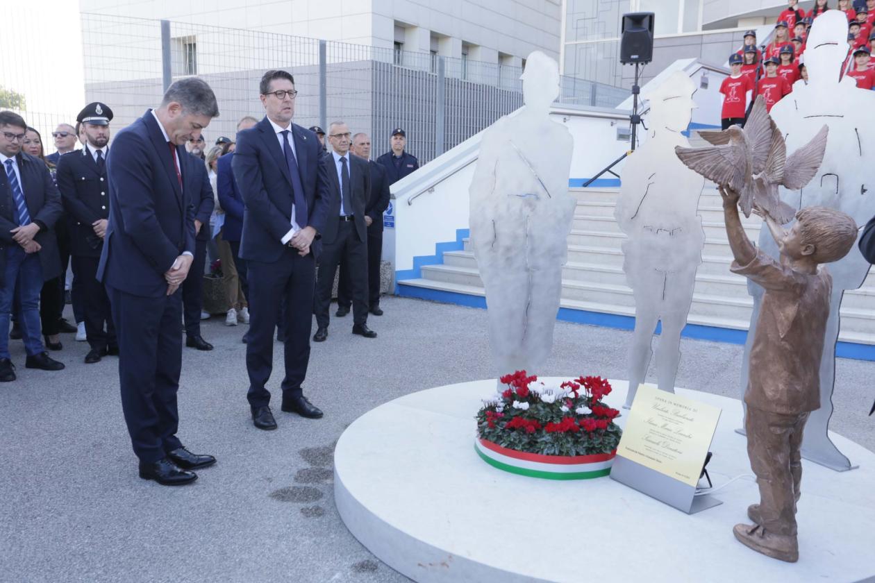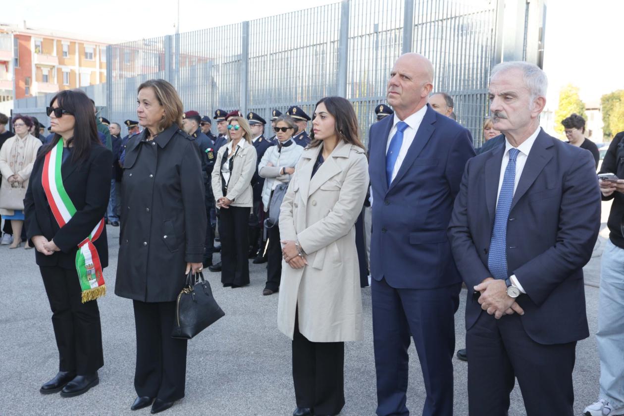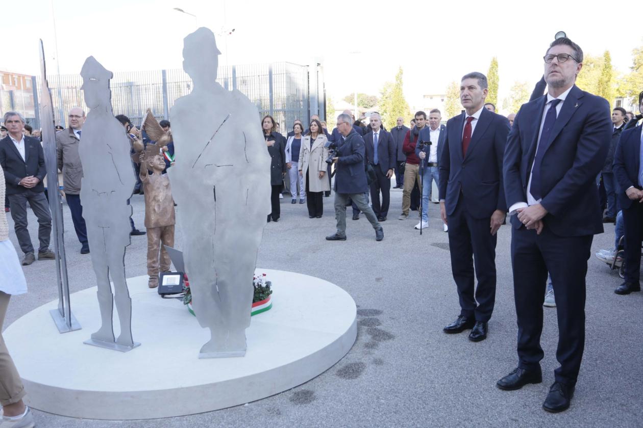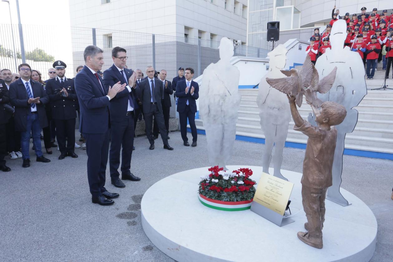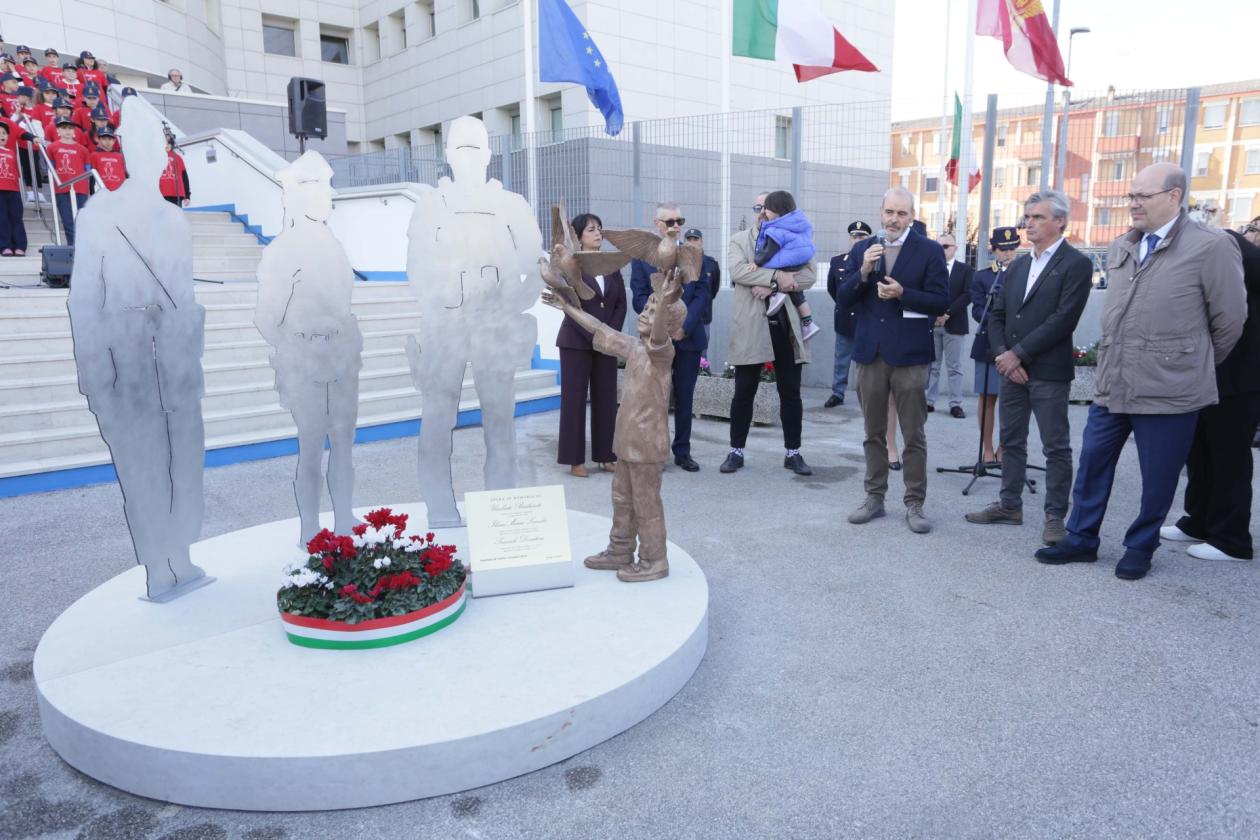 Sono tre colombe dorate quelle che ora volano verso il cielo, dalla scalinata della Questura. Commossa, sentita ma soprattutto partecipata, la cerimonia che ieri mattina ha svelato la nuova scultura, proprio all’ingresso dell’edifico, dedicata ai tre agenti della polizia di Stato caduti in servizio. Tre vite spezzate troppo presto: quella di Umberto Barbierato, 23enne arrestato il 2 maggio 1945 dai partigiani jugoslavi, primo polesano infoibato e mai più ritrovato, di Ilaria Maria Leandri, della polizia stradale di Rovigo deceduta nel 1997 dopo essere stata travolta da un veicolo industriale mentre eseguiva i rilievi di un incidente tra le carreggiate della A13, e ancora, Samuele Donatoni, agente del Nocs travolto da una pallottola involontaria durante il tentativo di liberare l’imprenditore Giuseppe Soffiantini dalla banda di sequestratori sardi, 28 anni fa come oggi. Caso, seppur in prescrizione, che ancora è ferita aperta per la famiglia, presente alla commemorazione. Tante le autorità civili, militari e religiose presenti, tra queste il prefetto Franca Tancredi, il procuratore di Rovigo, Manuela Fasolato, il sindaco Valeria Cittadin, il presidente della provincia Enrico Ferrarese, gli onorevoli Piergiorgio Cortelazzo, Nadia Romeo e Bartolomeo Amidei, gli assessori regionali Valeria Mantovan, Cristiano Corazzari, la consigliera Laura Cestari e il direttore generale dell’Ulss 5, Pietro Girardi, insieme ai comandanti delle forze dell’ordine. A suggellare la mattinata, la doppia intitolazione di due sale del plesso, quella riunione al “martire delle foibe”, Barbierato, e quelle conferenze a Donatoni. Con l’arrivo del sottosegretario all’interno, Nicola Molteni e Vittorio Pisani, capo della polizia, gli onori alla bandiera e ai caduti con la deposizione della corona d’alloro. Il corteo ha poi svelato il gruppo scultoreo realizzata dall’artista veronese Alessandro Mutto. Sono tre le sagome in acciaio che ritraggono i tre agenti, materiale, ha spiegato l’autore: “Che rappresenta l’etereo, permettendo di farci riflettere il cielo e la luce, come le anime dei tre agenti. In bonzo, invece, metallo più terreno, un bambino che accompagna in volo le colombe rappresentanti la vita spesa per l’altro e gli altri. Gli “Eroi di Rovigo”, come è stata intitolata, è stata poi benedetta dal vescovo della diocesi di Adria-Rovigo, Pierantonio Pavanello e sulle note dell’inno di Mameli, cantato dagli alunni delle elementari Donatoni del capoluogo, il momento è proseguito all’interno della questura.
