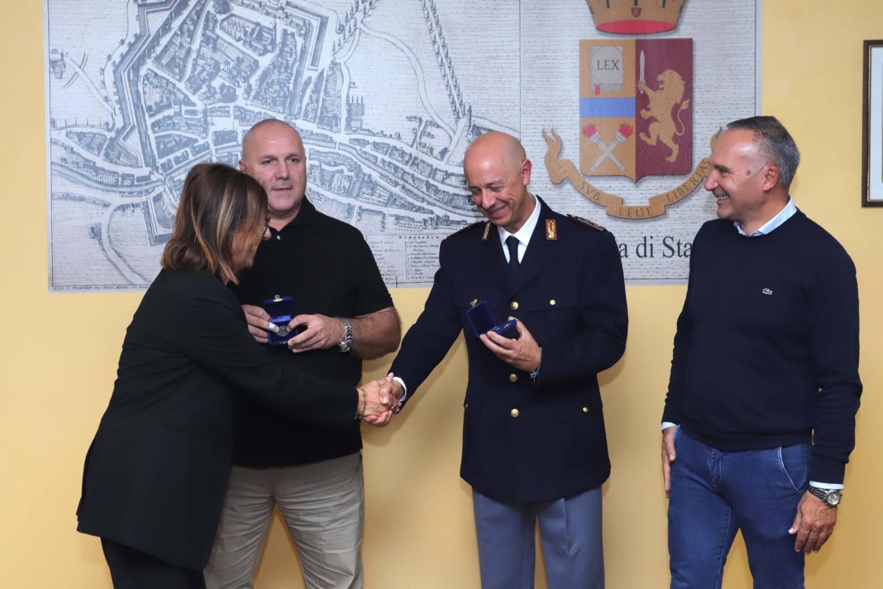 Una mattinata toccante e speciale, in questura a Rovigo, col pensionamento di due vere colonne della polizia in Polesine. Marco Brunoro, sovrintendente capo, veterano della Digos, e Luca Calonga, sovrintende capo coordinatore, “segugio” della squadra mobile. Per loro, visibilmente emozionati, l’abbraccio dei colleghi presenti, il videomessaggio di coloro che li hanno da poco preceduti in quiescenza, e un affettuoso saluto del proprio dirigente.