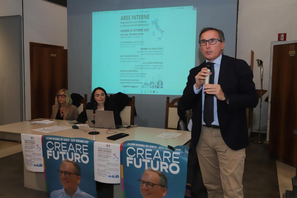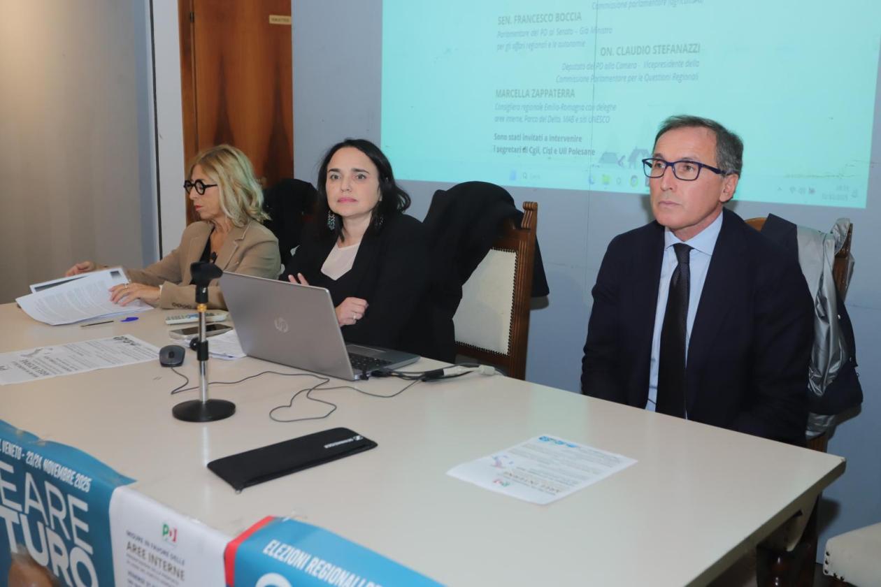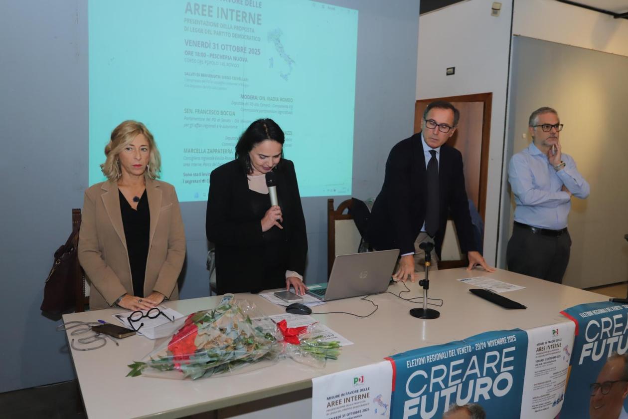 Si è aperto con un momento di profonda commozione e un mazzo di garofani rossi dedicati alla memoria di Nello Chendi, ad un anno esatto dalla sua scomparsa, il convegno del Pd che venerdì sera, in Pescheria Nuova, ha radunato oltre un centinaio di persone. Tutti in sala, molti in piedi, per partecipare alla presentazione della proposta di legge dem, prima firma Elly Schlein, contenente le “disposizioni per lo sviluppo economico e sociale delle aree interne”. Non un evento strettamente elettorale, ma la presentazione di un’iniziativa concreta per sostenere il futuro dei comuni più piccoli, meno densamente popolati e lontani dalle metropoli, dai grandi centri, dalle zona più affollate, che rischiano di sparire nel giro di pochi decenni a causa dell’inverno demografico. E a sostenere il progetto, tra i relatori, oltre alla deputata Nadia Romeo e al capogruppo in consiglio comunale e già deputato Diego Crivellari, anche il senatore Francesco Boccia e il consigliere regionale dell’Emilia Romagna Marcella Zappaterra, già presidente della Provincia di Ferrara.