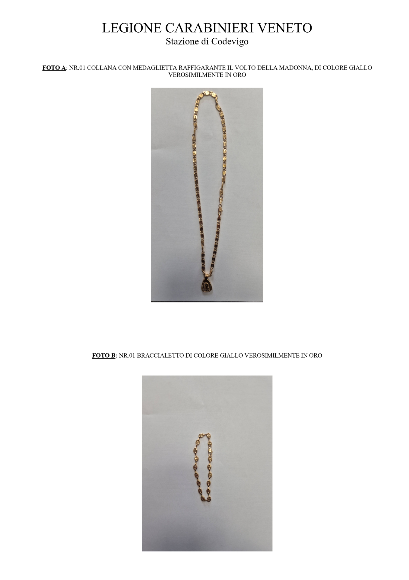 Chiunque ritenga di essere il legittimo proprietario dei monili, degli utensili o del drone sequestrati può rivolgersi ai carabinieri della Stazione di Codevigo per visionare il materiale. In caso di riscontri positivi, sarà possibile avviare le procedure previste per il dissequestro e la restituzione dei beni.