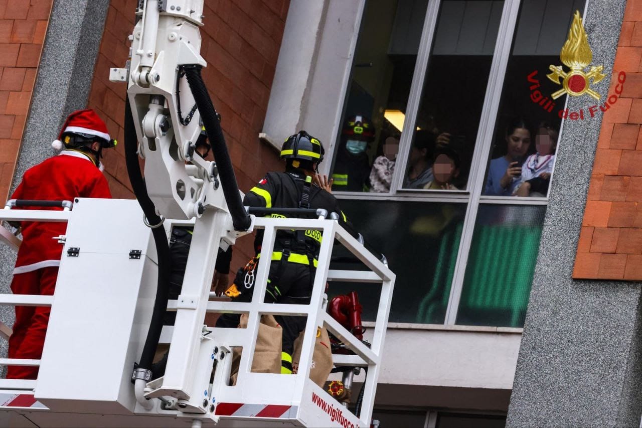 Per l’occasione, uno speciale Babbo Natale vigile del fuoco è arrivato in modo davvero sorprendente: calandosi dalla finestra a bordo di una particolare “slitta” meccanica, dotata di lampeggianti e sirene, tra lo stupore e l’entusiasmo dei piccoli pazienti.