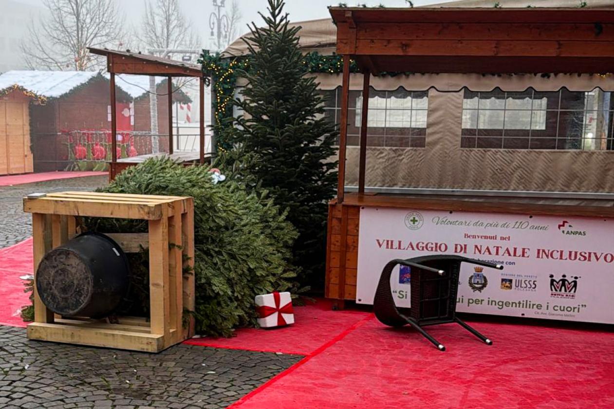 “Con quel badile è stata danneggiata anche l’alimentazione della pista di pattinaggio - precisa Barbujani - nella parte che contiene il fluido necessario alla refrigerazione”. Particolare indignazione ha suscitato anche l’abbattimento di uno degli alberi del villaggio inclusivo natalizio della Croce Verde, allestito proprio in questi giorni in piazza.