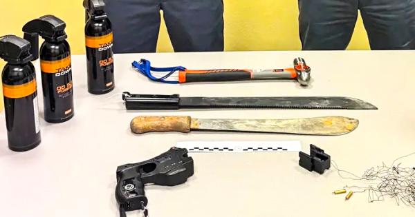 La successiva perquisizione del veicolo ha portato al rinvenimento di quello che gli investigatori hanno definito un vero e proprio kit offensivo: due machete con lame lunghe 35 e 45 centimetri, una pistola taser a impulsi elettrici dotata di puntatore laser, tre bombolette di spray urticante con impugnatura balistica e un martello con testa sferica. Durante il controllo personale, il giovane è stato inoltre trovato in possesso di circa tre grammi di hashish e di oltre 300 euro in contanti.