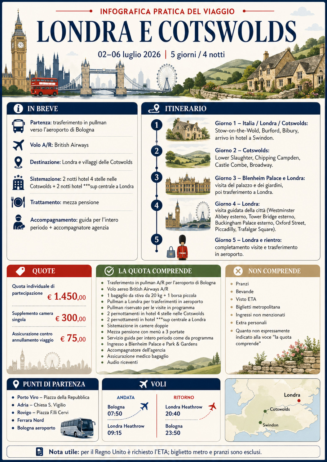 Per chi desidera vivere questo itinerario con un’organizzazione accompagnata, Fulvia Tour propone “Londra e Cotswolds” dal 2 al 6 luglio 2026, con partenza dall’Italia, visite guidate, accompagnatore dell’agenzia, due pernottamenti nelle Cotswolds, due a Londra e ingresso a Blenheim Palace. Un viaggio breve ma denso, pensato per scoprire l’Inghilterra dei villaggi e quella della capitale in un unico racconto.