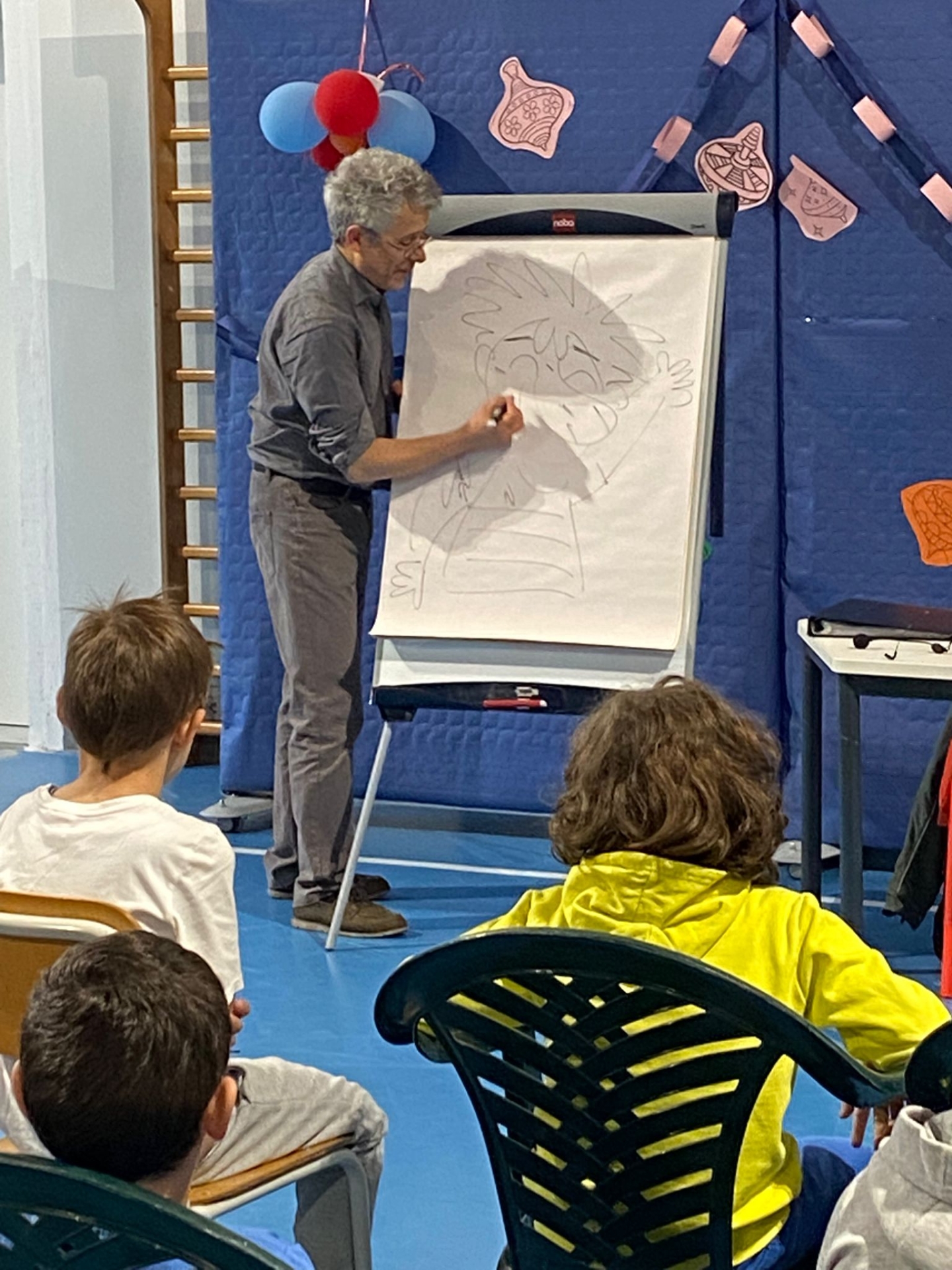 Ma al centro dell’incontro non c’è stato soltanto un protagonista. Il filo conduttore della lezione è stato il funzionamento stesso delle storie. Ai bambini Frasca ha spiegato che ogni racconto nasce prima di tutto da un personaggio, da un carattere e da una voce, e che solo in un secondo momento attorno a quella presenza prende forma la trama.