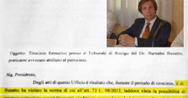 Una cosa che la legge vieta nella maniera più assoluta. E i motivi sono evidenti. Busatto ha svolto il proprio tirocinio dal 25 novembre 2015 al 24 maggio 2017. E come si difende Busatto? Citando una lettera (di cui non dice la data che, per quanto ne sappiamo, potrebbe - anzi, a rigor di logica, dovrebbe – essere precedente a quella del presidente del Tribunale del 25 settembre) e neppure il firmatario, ma più semplicemente “il giudice che ha redatto la relazione finale sul tirocinio”). Ma tant’è. La lettera di questo giudice dice - scrive Busatto - che nulla è accaduto che “possa compromettere il pieno giudizio positivo nei confronti del dott. Barnaba Busatto”.