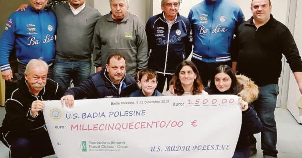 BADIA POLESINE - L’Unione sportiva Badia dona 1.500 euro alla Fondazione di ricerca fibrosi cistica. Continuando il percorso iniziato la scorsa primavera con l’organizzazione di un torneo di beneficenza, l’associazione sportiva ha deciso di compiere un gesto di solidarietà anche in occasione delle festività natalizie. “Nel corso del pranzo sociale dei giorni scorsi – ha detto il presidente dell’Us Badia Natale Ferrari al momento della consegna dell’assegno simbolico - abbiamo pensato di organizzare una lotteria e di devolvere il ricavato a questa onlus per la ricerca sulla fibrosi cistica”. “E’ una bella iniziativa – ha aggiunto l’assessore allo Sport Stefano Baldo – che si aggiunge alla vendita dei panettoni, sempre a scopo benefico. Il progetto di raccolta fondi va avanti ormai da un anno e mezzo, per cui un ringraziamento va all’Us Badia perché, oltre alla parte sportiva, si impegna anche in altri fronti. Un ringraziamento anche al vicepresidente Luca Bedendo e sua moglie Marianna, che sensibilizzano su questo argomento: quando si collabora, i risultati si vedono. Nei giorni scorsi, inoltre, la Prima squadra e una delegazione del settore giovanile hanno fatto visita agli ospiti della Casa del sorriso: sono tutti piccoli tasselli che fanno capire che, oltre ad essere dei calciatori, sono innanzitutto delle persone”.