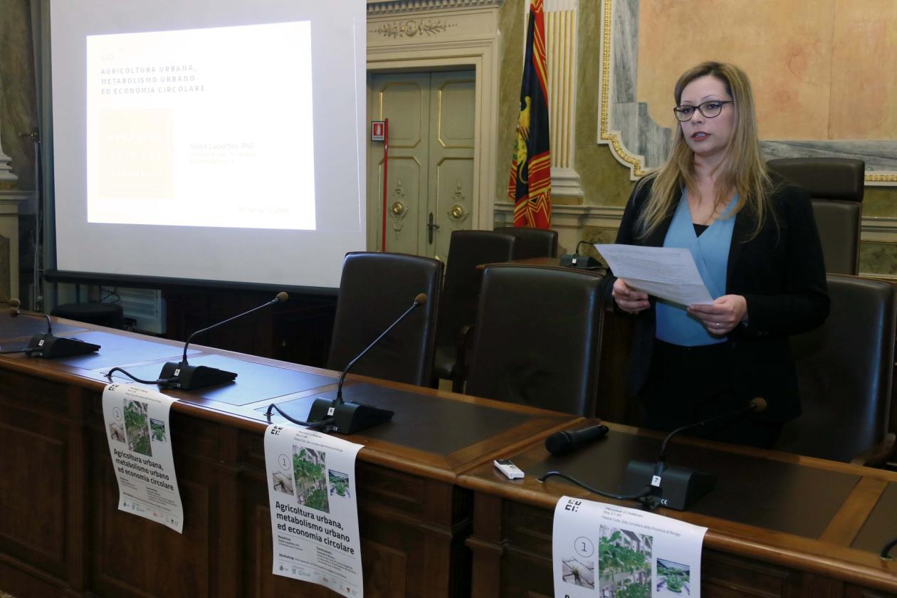 La professoressa Giulia Lucertini, ricercatrice dell' Università Iuav di Venezia, ha presentato esempi e buone pratiche per un consumo delle risorse naturali sostenibile e rigenerativo, con particolare attenzione alle politiche locali del cibo e dell'agricoltura urbana, considerandone gli aspetti multifunzionali dal punto di vista economico-sociale - per la rigenerazione dello spazio e la creazione di economie sostenibili - e dal punto di vista ambientale - per la resilienza dei sistemi urbani e l’adattamento ai cambiamenti climatici.