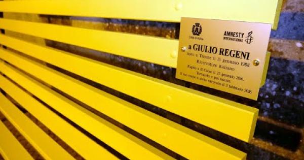 ADRIA - Una panchina gialla per Giulio Regeni, in difesa degli ideali di giustizia e libertà: l'amministrazione comunale di Adria, in collaborazione con Amnesty international, ha installato in piazza Bocchi nelle adiacenze del muro perimetrale della biblioteca comunale, una panchina gialla dedicata al giovane friulano Giulio Regeni. La cerimonia questo pomeriggio, nella ricorrenza del quinto anniversario della tragica morte del ricercatore universitario, avvenuta dopo essere stato sequestrato e torturato in un quartiere periferico del Cairo. Alla scopertura della targa affissa sulla panchina sono intervenuti il sindaco Omar Barbierato, l’assessore Andrea Micheletti e Giovanni Stefani responsabile del Gruppo 215 di Rovigo di Amnesty International.