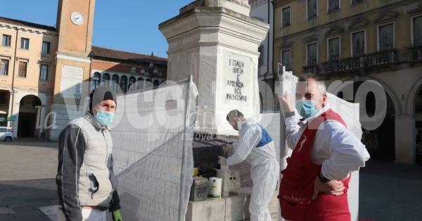 Sono partiti questa mattina i lavori per cancellare le scritte dal monumento dedicato a Vittorio Emanuele, in centro a Rovigo.