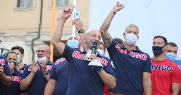 Inizio della festa scudetto con gli Psycodrummers, gruppo di percussionisti polesano, poi il momento più atteso: uno ad uno sono stati chiamati i Bersaglieri sul palco tra due ali di fumogeni rossoblù accesi dalle fedelissime e sempre presenti Posse Rossoblu. Ad ogni nome annunciato dallo speaker, Andrea Trombini, il pubblico è esploso in applausi e cori. E tra “i campioni dell’Italia siamo noi” e “chi non salta è padovano”, quando è salito sul palco il rodigino doc, Matteo Ferro, è partito: “Un capitano, c’è solo un capitano” che ha fatto commuovere capitan Teo, vera e propria bandiera per la città di Rovigo sia in campo che fuori. Ma i più applauditi di tutti sono stati sicuramente il presidente Francesco Zambelli, in lacrime per l’emozione, e Umberto Casellato, l’head coach rossoblù.