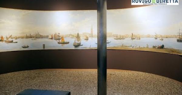 ROVIGO - Pascaline Vatin e Giandomenico Romanelli, co-curatori della mostra "Venezia Panoramica - La scoperta dell'orizzonte infinito", illustrano il "Panorama di Venezia" del Biasin, 23 metri di tela che ritraggono la Serenissima, esposti a Palazzo Roverella.