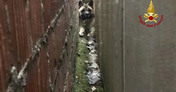 Sascia, il cagnolone rimasto incastrato tra due muri salvato dai pompieri