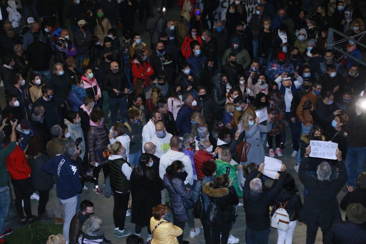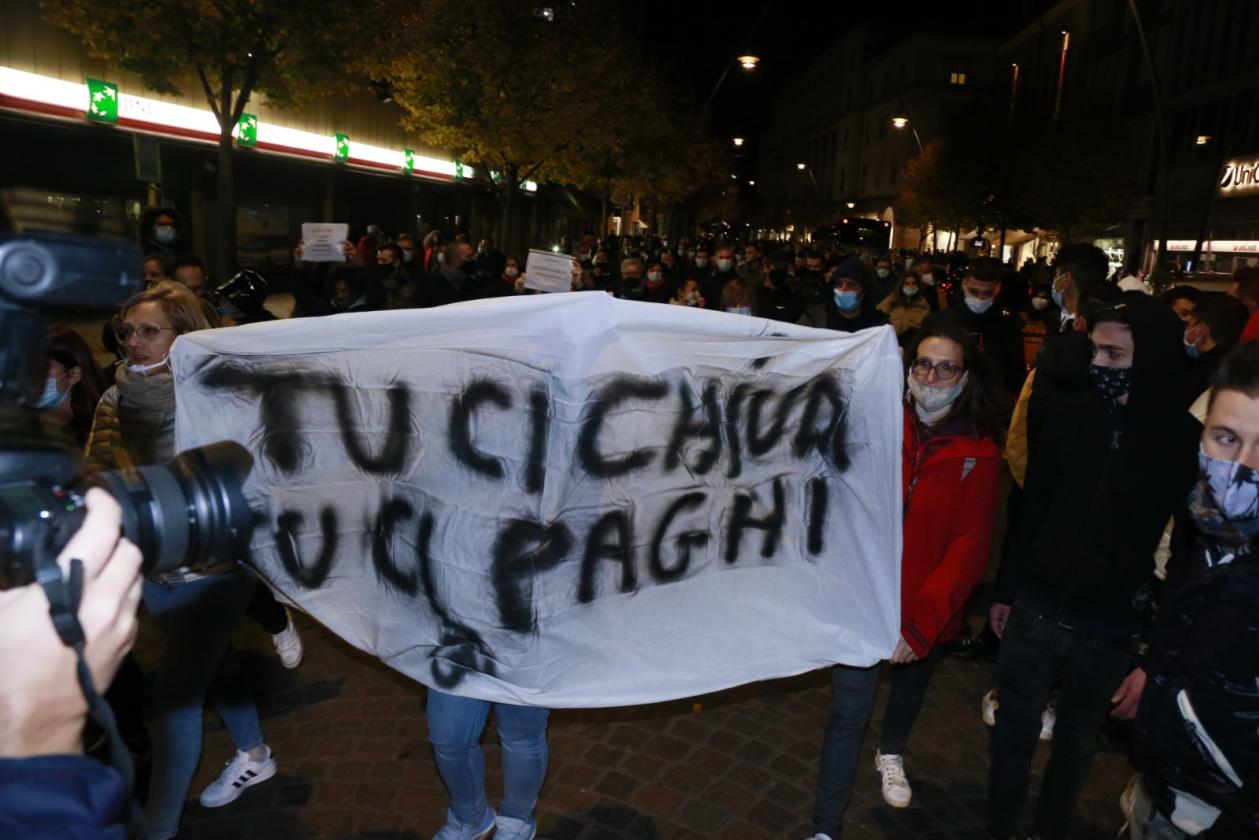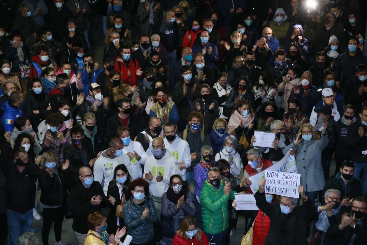 Sono arrivati i titolari di palestre e piscine, chiuse, baristi e ristoratori, con chiusura anticipata alle 18, ma anche tanti cittadini che sostengono questa protesta. Tanti cartelli e un grido che si è alzato dalla folla: "Fateci riaprire, vogliamo lavorare". Numerose le obiezioni sollevate dai presenti: la coerenza e la funzionalità di queste misure, rispetto ad altri settori che, invece, rimangono operativi; ma anche l'effettività dei ristori che dovranno arrivare, immediatamente a quanto ha detto il premier Conte nell'annuncio in diretta alla nazione domenica. E, anche, la profonda umiliazione di chi ha messo tutto se stesso nella propria impresa e ora si sente definire "attività non essenziale".