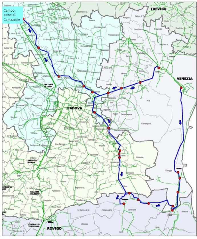 Il Sistema degli acquedotti del Veneto centrale è formato da 150 km di tubi, nuovi pozzi di prelievo per 950 litri/secondo e nuovi serbatoi di accumulo capaci di contenere 7.000 metri cubi, con un investimento complessivo di 170 milioni di euro. Grazie al nuovo campo pozzi di Camazzole, nel Comune di Carmignano di Brenta (PD), sarà possibile rifornire di acqua potabile di ottima qualità le aree orientali delle province di Padova, Rovigo e Venezia. Circa 600.000 persone che attualmente utilizzano per usi idropotabili l’acqua del Po e dell’Adige, di qualità organoletticamente inferiore e con costi di potabilizzazione elevati.