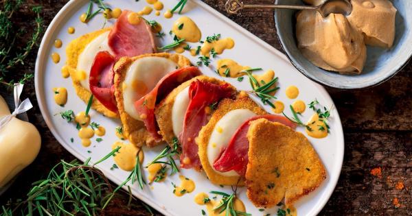 Iniziare con l’impanare le fette di carne nella farina di mais e cuocerle un minuto per lato in una padella con due cucchiai di olio di semi ben caldo e un pizzico di sale. A questo punto, togliere le scaloppine dalla padella, eliminare l’olio e unire mezzo bicchiere di acqua e due cucchiai di senape. Cuocere il sugo per quattro-cinque minuti circa, mescolando costantemente. Disporre su ogni scaloppina una fetta di scamorza e una di prosciutto, quindi appoggiarle delicatamente una sull’altra in un piatto adatto ad essere messo in forno. Infornarle a 190 gradi per circa quattro-cinque minuti. Servirle in tavola completando con la salsa alla senape e con il rosmarino a piacere.
