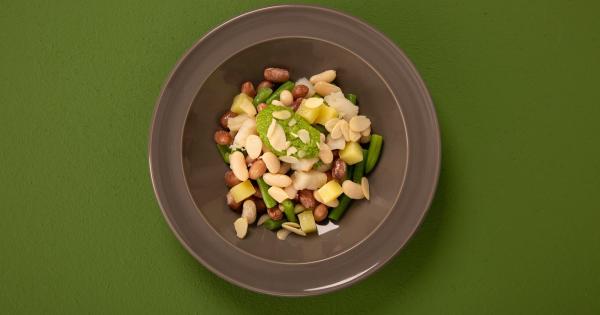 Quando parliamo di baccalà, pensiamo subito a cotture lunghe, elaborate e difficili, mentre, per preparare questa insolita insalata, saranno sufficienti 15 minuti. Iniziare facendo bollire l’acqua nella pentola. Quando avrà raggiunto il bollore, versare nella pentola il baccalà tagliato a tranci e i Legumissimi. Lasciare cuocere per 8 minuti, scolate e lasciate raffreddare. A questo punto, frullare in un bicchiere un po’ di ghiaccio con la rucola, le mandorle, l’olio extravergine d’oliva, sale e pepe, fino a creare un pesto di consistenza densa. Mescolare l’insalata di legumi e baccalà con il pesto di rucola e passare ad impiattare spolverando con qualche scaglia di mandorla. Una variante è di fare le singole porzioni in piccole ciotole per ciascun commensale, avendo cura di disporre bene gli ingredienti con il trancio di baccalà al centro.