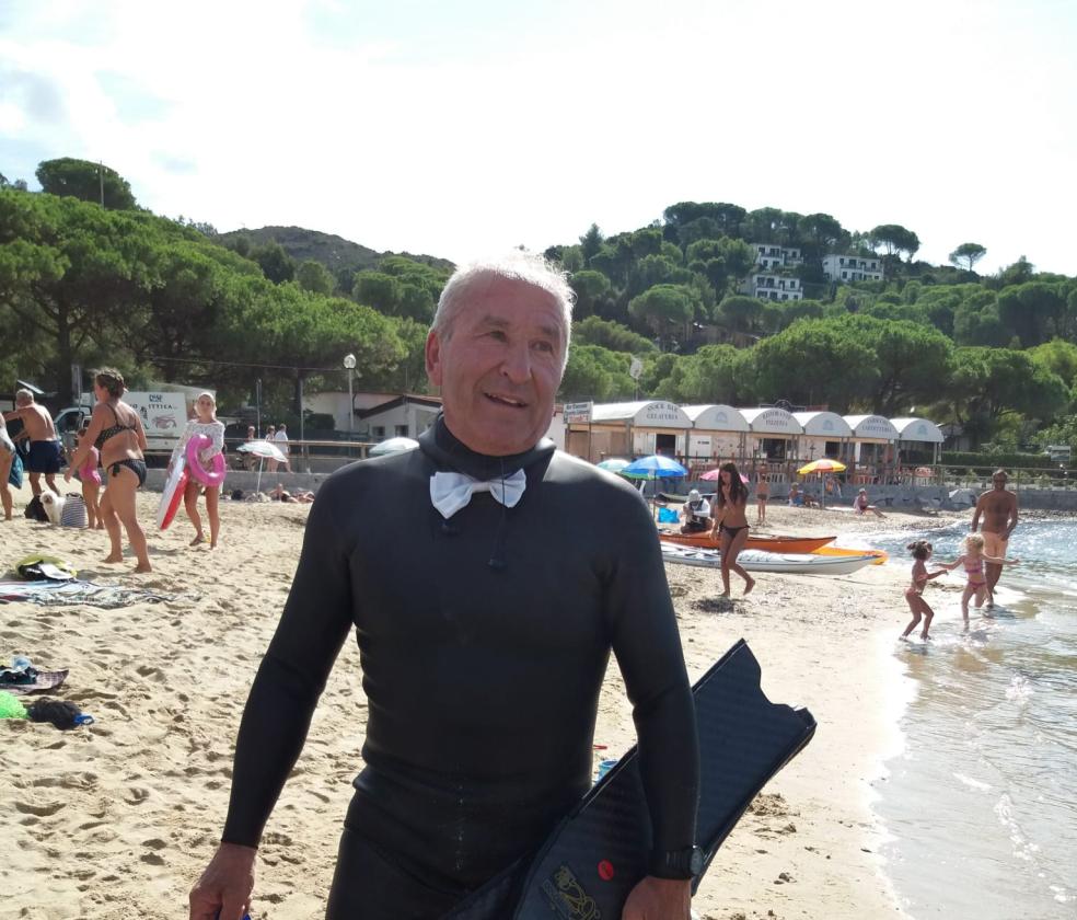 Missione compiuta. Venerino Tosini, il recordman di Bosaro, ha portato a termine con successo una nuova straordinaria impresa, l’ultima della sua carriera. Lunedì sera alle 19, si è tuffato da una barca a vela nelle acque del Mar Tirreno, a un chilometro dall’isola di Montecristo diretto verso l’isola d’Elba. La traversata è durata tutta la notte: il 66enne ha toccato terra stamattina alle 10.50, dopo aver percorso a nuoto ben 23 miglia nautiche, cioè circa 43 chilometri.
