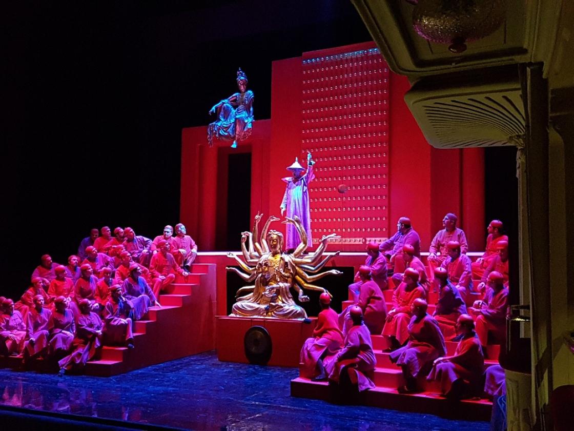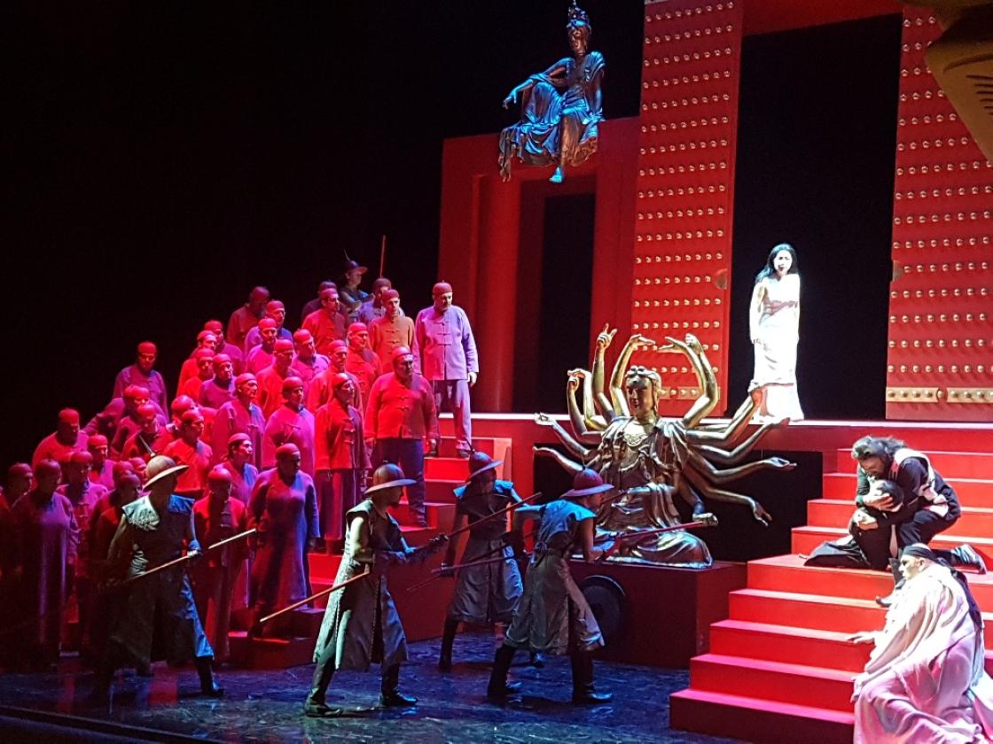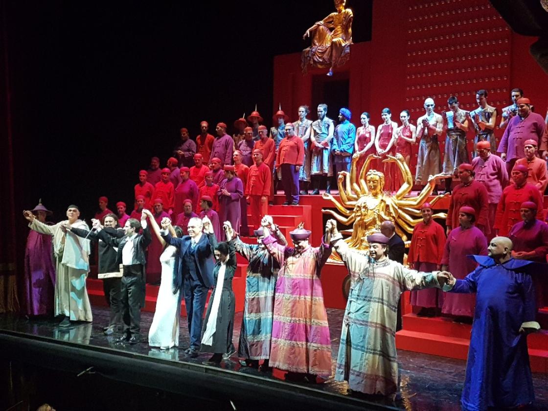 Pienamente vinta la sfida del regista di creare per il palcoscenico rodigino un continuum travolgente (fatto raro), in unica sequenza senza intervalli, sullo sfondo di un impianto scenico permanente astratto, che ha trascinato il pubblico senza tregua in una fortissima tensione fino al coinvolgente finale. Straordinario il cast dei cantanti: il potente tenore Walter Fraccaro (Calaf), che ha stregato il pubblico con l’interpretazione bissata della celebre aria “Nessun dorma”, il delicato soprano melodico Angela Nisi (Liù), l’abile soprano coreano Lilla Lee, dalla notevole estensione vocale, vestita in un elegante abito sobrio (Turandot-la principessa di ghiaccio); perfettamente in sintonia i tre ministri, quasi una persona unica: Italo Proferisce, Nicola Pisaniello e Davide Ferrigno (Ping, Pong, Pang) e il basso Ivan Tomasev (Timur). Importante anche il ruolo del Coro lirico veneto nei frequenti contrappunti corali. Magistrale l’esecuzione dell’Orchestra regionale filarmonica veneta diretta dal maestro Simon Krecic