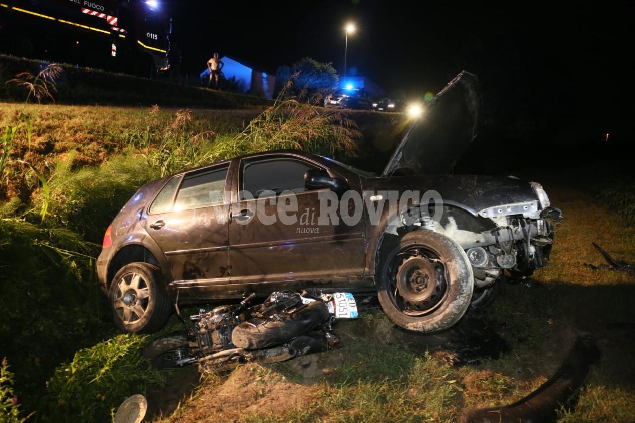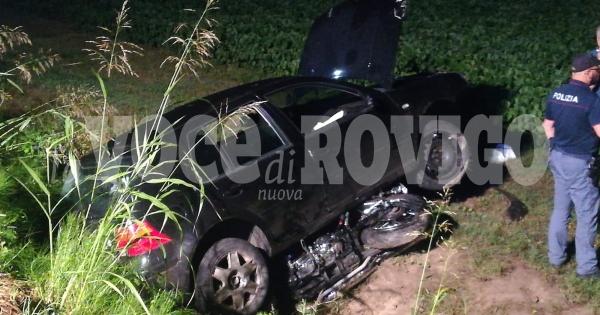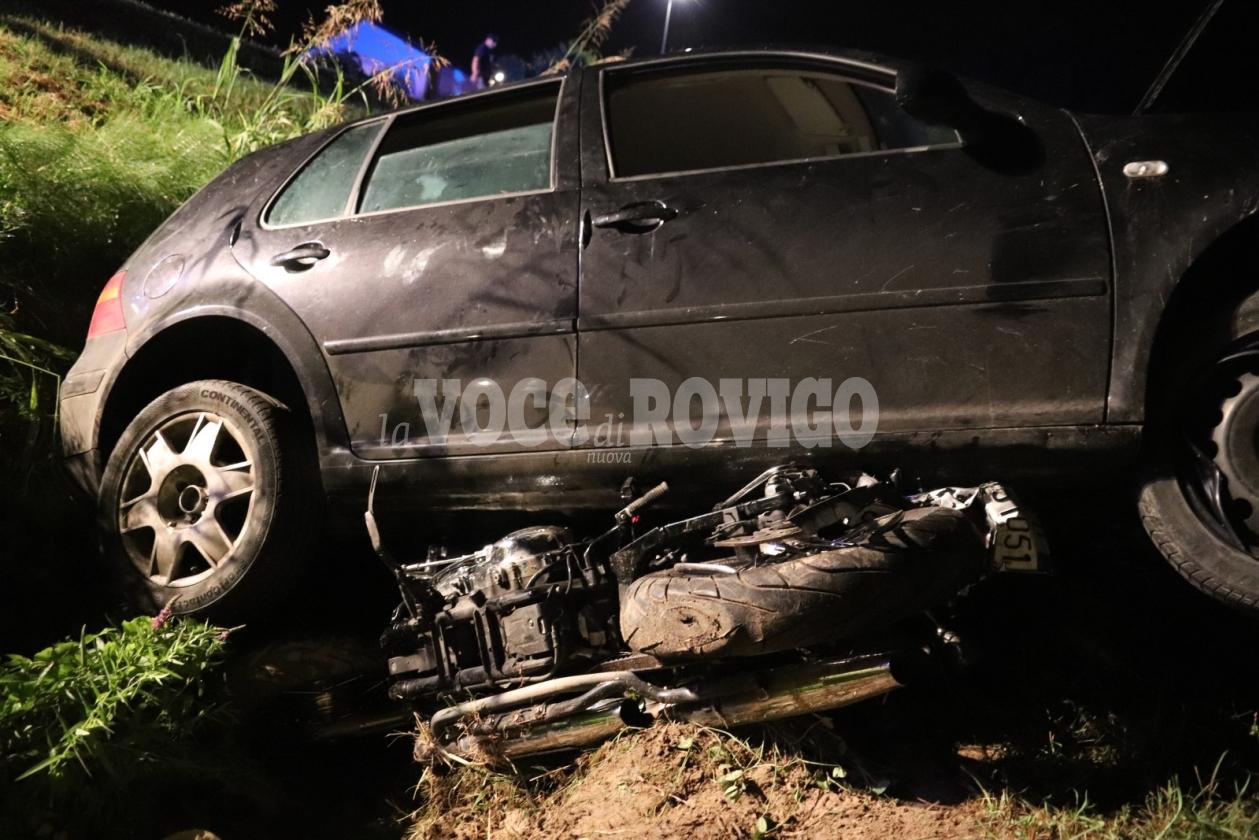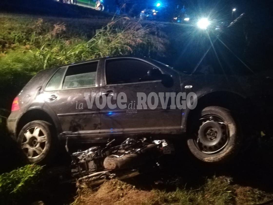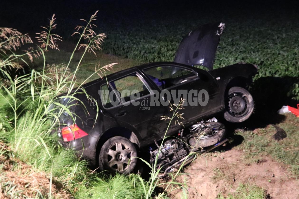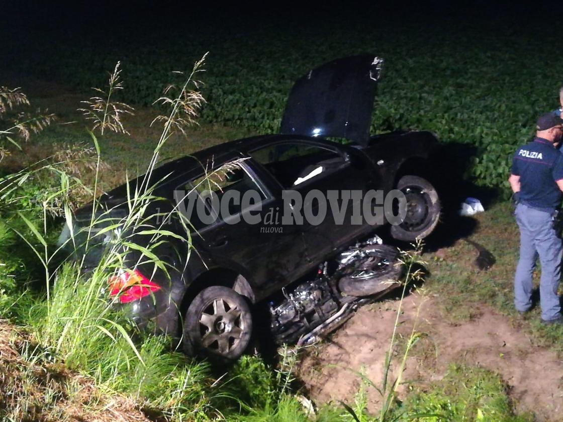 La moto è quindi rimasta incastrata sotto al veicolo, che ha continuato a trainarla per alcune centinaia di metri, prima di finire fuoristrada, per fortuna dalla parte dei campi, invece che da quella del canale.
