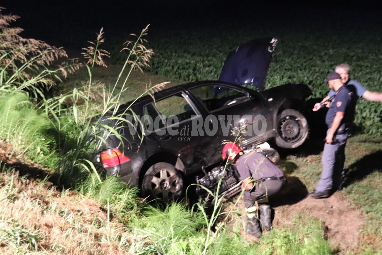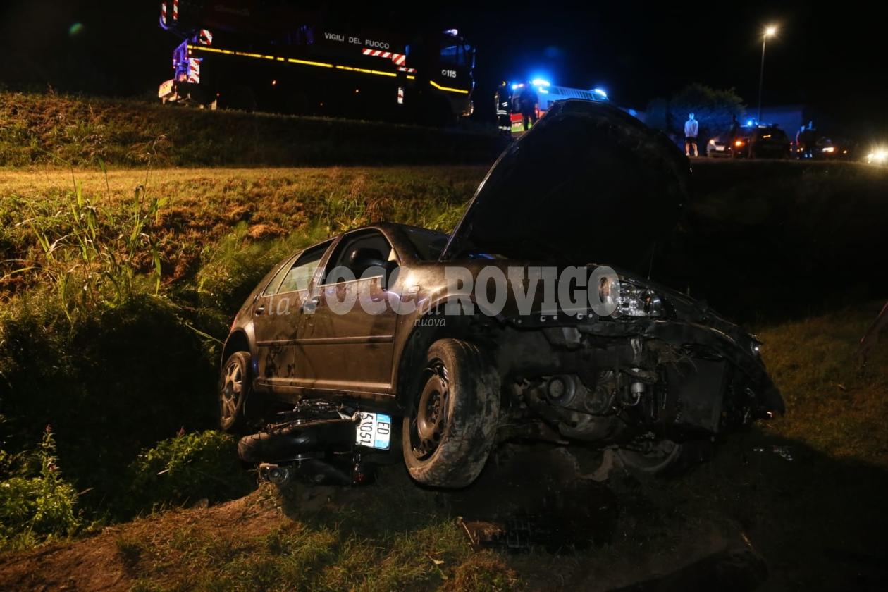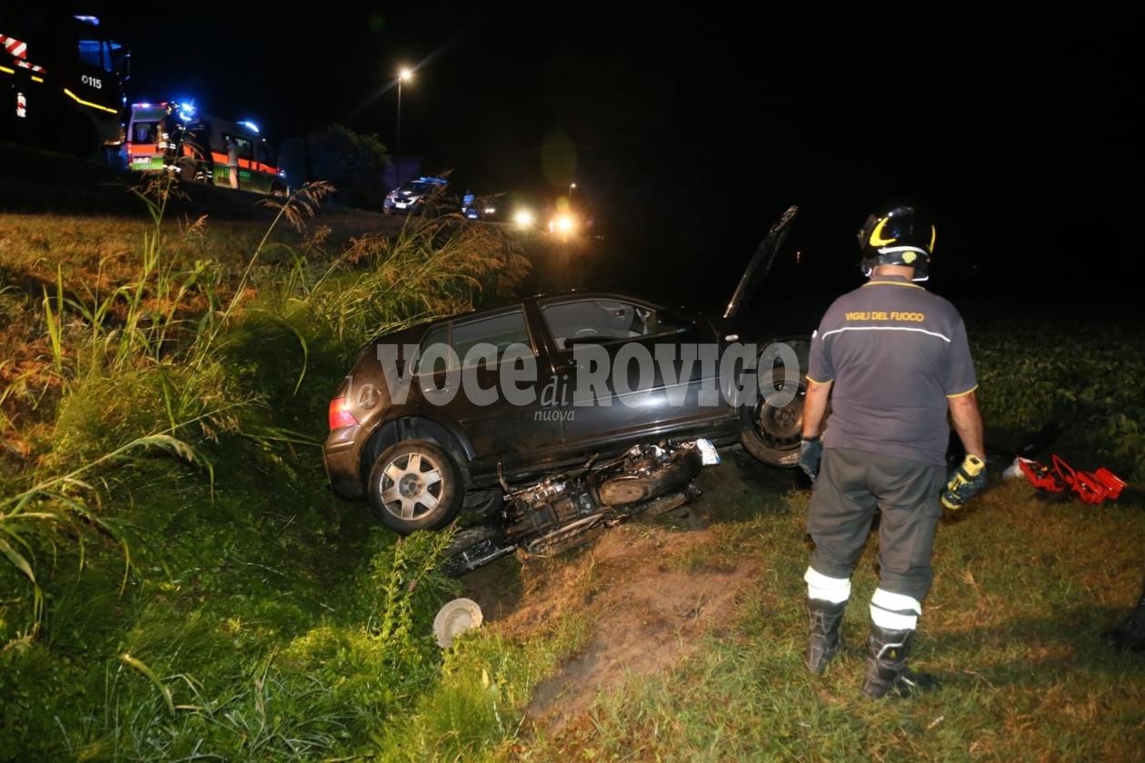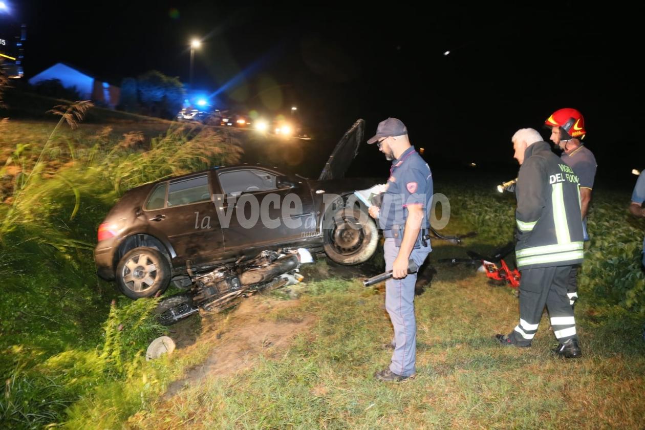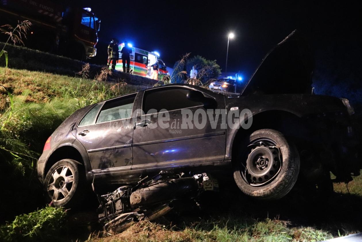 La moto è quindi rimasta incastrata sotto al veicolo, che ha continuato a trainarla per alcune centinaia di metri, prima di finire fuoristrada, per fortuna dalla parte dei campi, invece che da quella del canale.