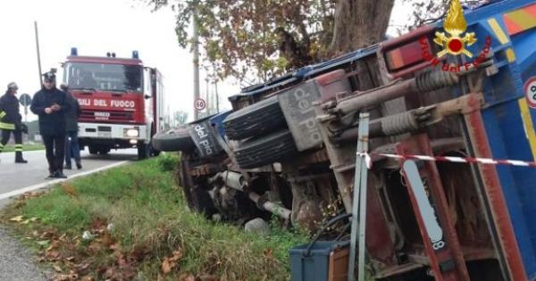 Questa mattina i vigili del fuoco sono intervenuti sulla Provinciale 45 vicino al parco Valcorba a Pozzonovo per un camion rovesciato su un fianco dopo la perdita di controllo del conducente, rimasto ferito.