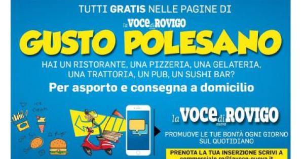 Da qui il contenitore “Gusto Polesano” che trovate sulla Voce e che andrà avanti fino a quando le esigenze lo richiederanno, cioè fino alla ripartenza vera, non quella fittizia di queste settimane. All’interno i ristoranti, le trattorie, le pizzerie, i bar, i sushi bar... insomma tutti quelli che hanno scelto di affidarsi all’asporto o alla consegna a domicilio pur di restare aperti, potranno pubblicare gratuitamente la loro pubblicità. Questo spazio è completamente a loro disposizione. In omaggio e senza alcuna spesa. Per essere inseriti è sufficiente scrivere una mail a commerciale.ro@lavoce-nuova.it.