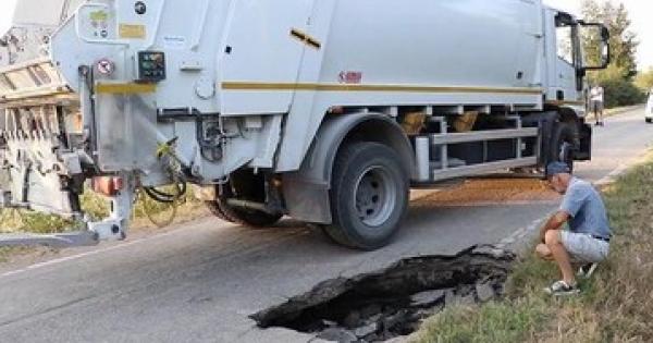Il camion appena liberato dall'enorma buca (grazie a www.lanuovaferrara.gelocal.it)