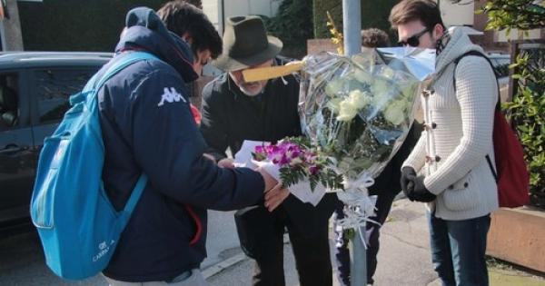 Gli amici di Antonio mentre depongono dei fiori sul luogo dell'incidente