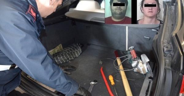 La coppia di truffatori e degli arnesi da scasso sequestrati dai Carabinieri
