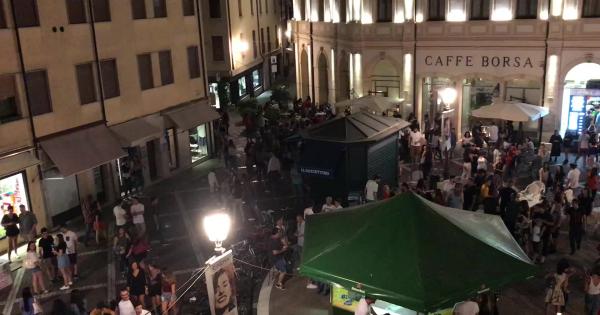Piazza Garibaldi di Rovigo piena di giovani che non vedevano l'ora di poter festeggiare il ritorno dell'Aperitivo del giovedì organizzato dal Caffè Borsa, dal Caffè Garibladi, da Vesuvio Pizzeria Ristorante, Eya e Inki Makisushi restaurant.