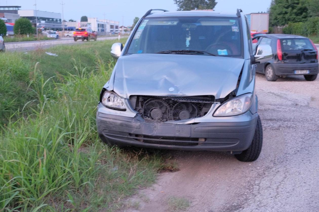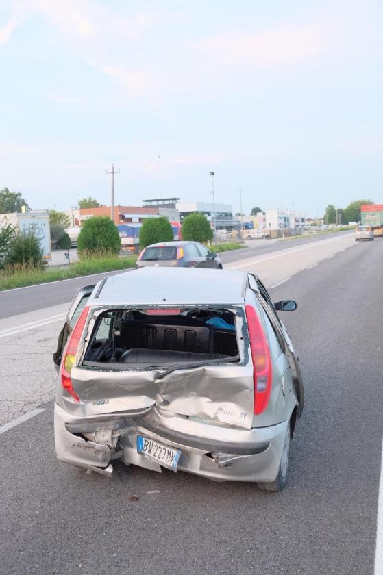 Brutto schianto, fortunatamente senza feriti gravi, oggi pomeriggio 6 settembre, alle 18,30 circa, sulla Tangenziale, tra la rotatoria di Spianata e il semaforo di Borsea, all'altezza del ristorante "Il Fogolar".