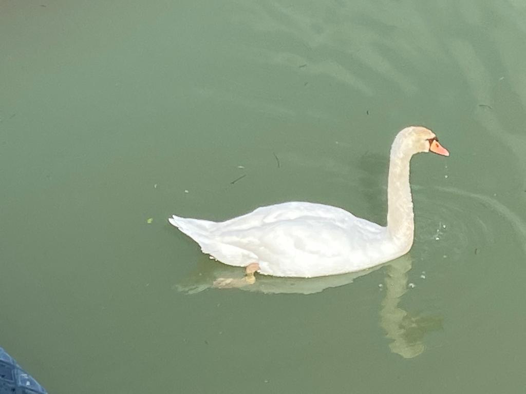 Un grande cigno che nuota placido nelle acque del canale del porticciolo, in zona Interporto.