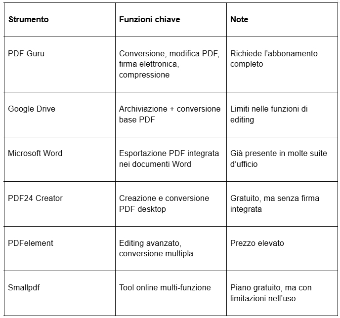 Vogliamo ora considerare il posizionamento di PDF Guru rispetto ai competitor. Abbiamo valutato non solo il prezzo, ma anche la semplicità d’uso. Anche la copertura delle funzioni e i limiti operativi sono fattori importanti. Questo è un confronto diretto per capire meglio come si posiziona rispetto ad altri strumenti usati: Guru PDF è la scelta giusta per la gestione dei file quotidiana. Il software bilancia bene il set completo di funzioni con il prezzo richiesto. Non richiede inoltre un tipo di apprendimento tecnico.
