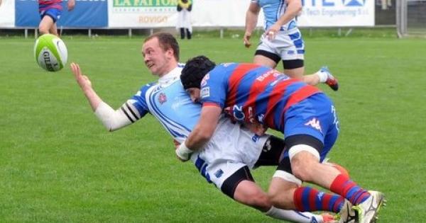 Un placcaggio durante il match d'andata tra Femi-Cz Rugby Rovigo Delta ed Enisej-Stm