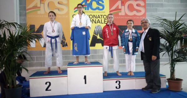 Il 29 aprile poi si è svolto il campionato nazionale Aics a Riccione con atleti da tutt’Italia, dal Piemonte alla Sicilia. Fujiyama Dojo (in rappresentanza del comitato provinciale di Rovigo) era presente con quattro atleti. Nella giornata di domenica è stata la volta del kata, dove i polesani hanno raccolto ottimi risultati. Marco Fracasso si piazza al primo posto nella categoria Cadetti fino a blu, supera brillantemente le fasi eliminatorie , e in finale vince 4-1. Agnese Saretto centra il primo posto nella categoria Cadetti femminile, Kevin Rizzo si piazza terzo nella categoria Cadetti fino a blu e sale sul podio assieme a Marco, e infine Giada Fracasso arriva al secondo posto. Il giorno dopo erano di scena i combattimenti, ed i ragazzi di Fujiyama Dojo si sono ben comportati: Marco Fracasso e Agnese Saretto hanno bissato i due primi posti del giorno prima nelle rispettive categorie, stessi piazzamenti anche per Giada e Kevin nelle loro categorie. Il gruppo polesano quindi ottiene quattro ori, due argenti e due bronzi: un ottimo risultato che tiene alto il nome della provincia di Rovigo.
