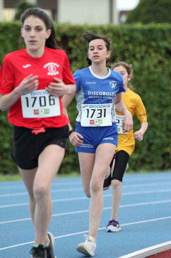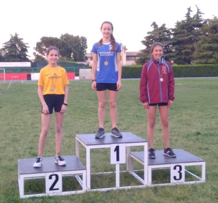 Dalla pedana a fianco, riservata al lancio del vortex categoria Ragazze, le rispondeva Aurora Zullato, che agguantava il terzo posto grazie ad un ultimo bel lancio a 34,22 metri. L'intenso programma di gare veniva chiuso dalla prova sui metri 1000, sempre della categoria Ragazze; ed è proprio il caso di dire che veniva chiuso così come era stato aperto, ossia con il secondo successo giornaliero di Elena Crepaldi, che dopo aver resistito all'attacco iniziale di un'avversaria, faceva una cavalcata in solitaria per quasi settecento metri, fermando il crono a 3'24”60, grande tempo. Nella stessa gara ottimi piazzamenti per Ilaria Nezzo, quinta ad un secondo dal podio, e Chiara Arcidiacono, decima.