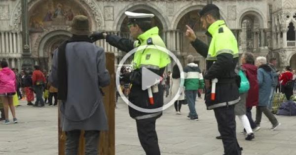 Si vede il suo arrivo, il montaggio dell'installazione "Venice in oil", e poi i vigili che lo mandano via perché senza permesso.